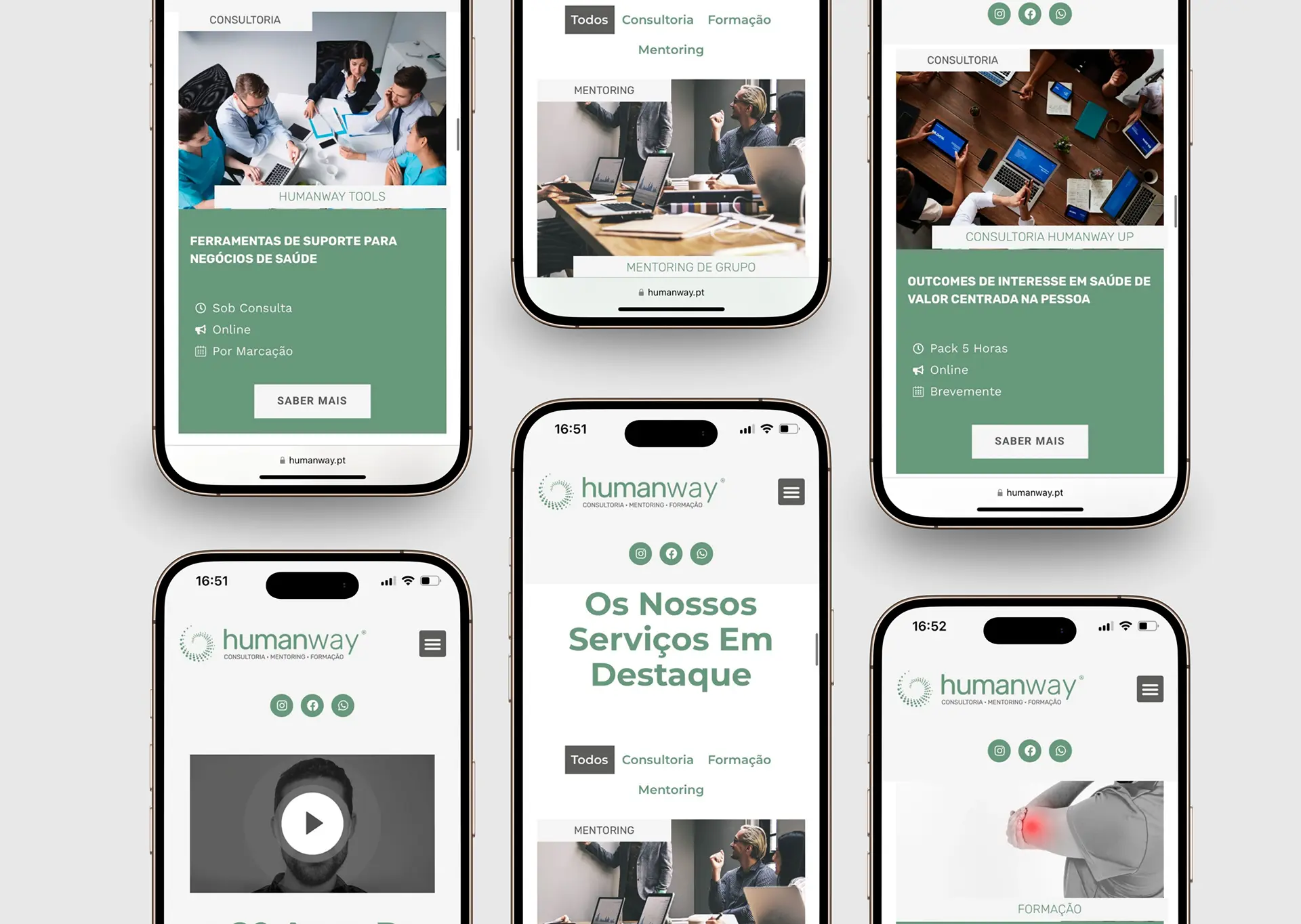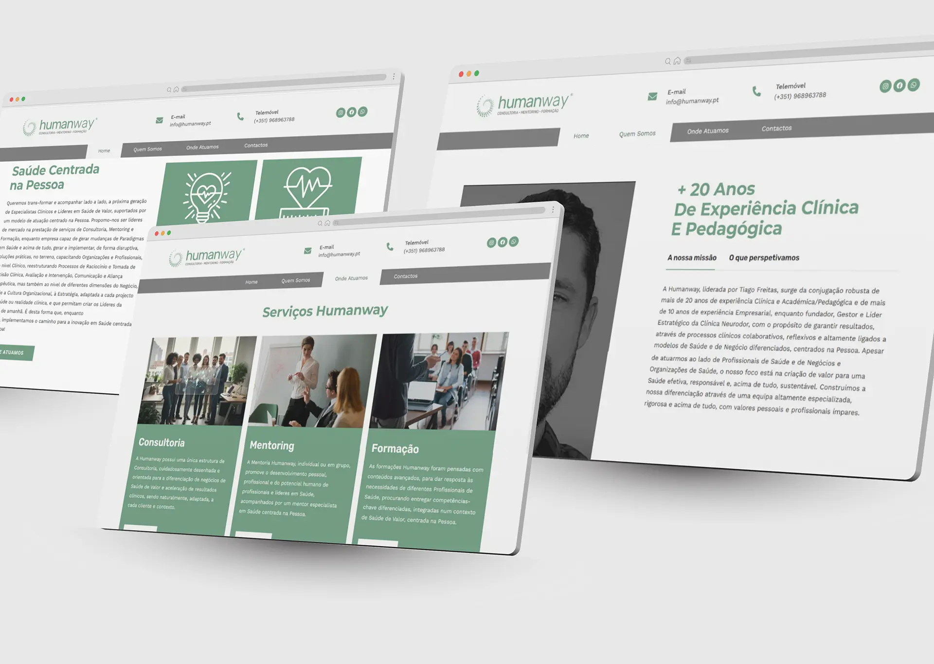 Embora seja um website one page, foram criadas páginas dedicadas aos serviços e formações, garantindo que cada área tivesse espaço para detalhar conteúdos estratégicos e transmitir o valor da marca.